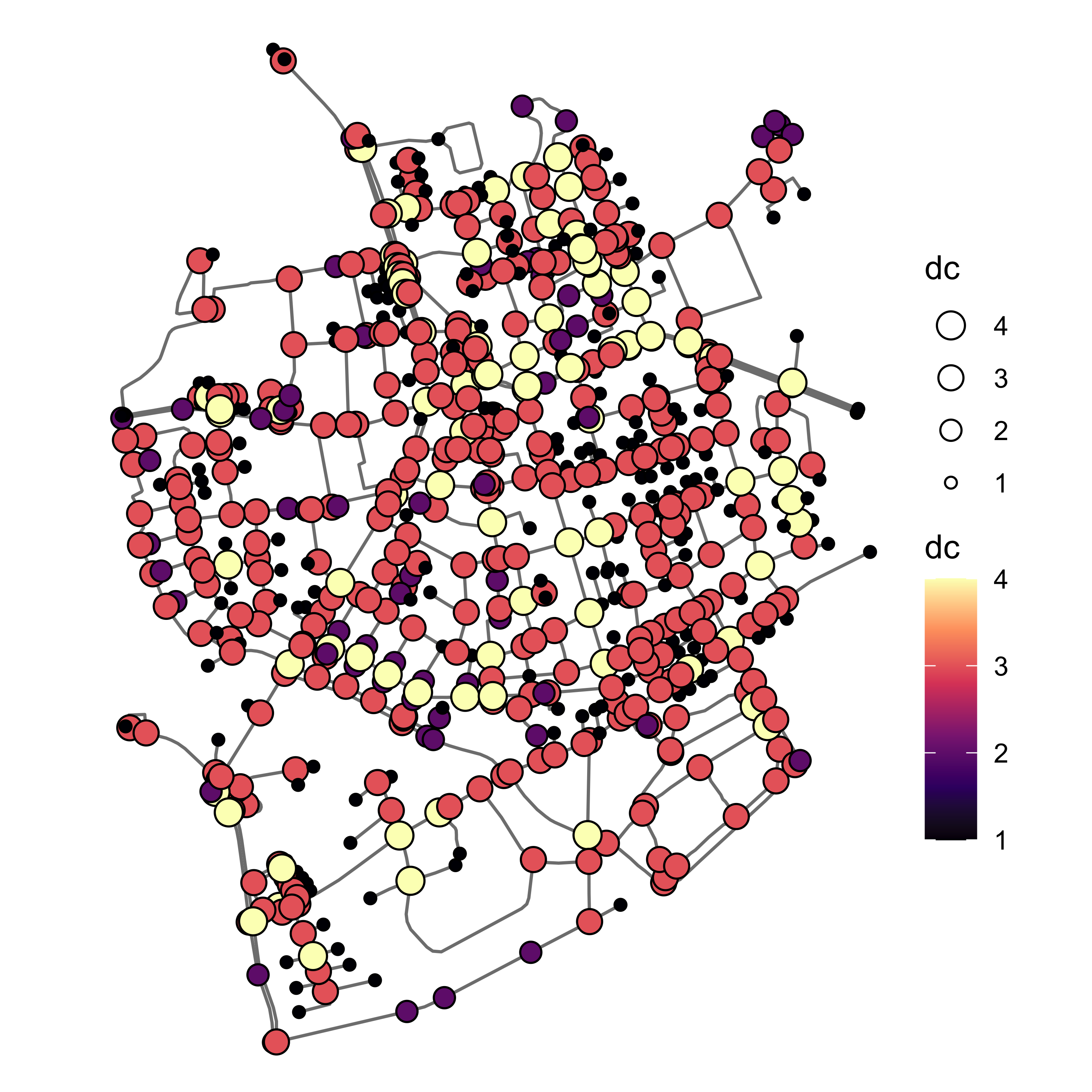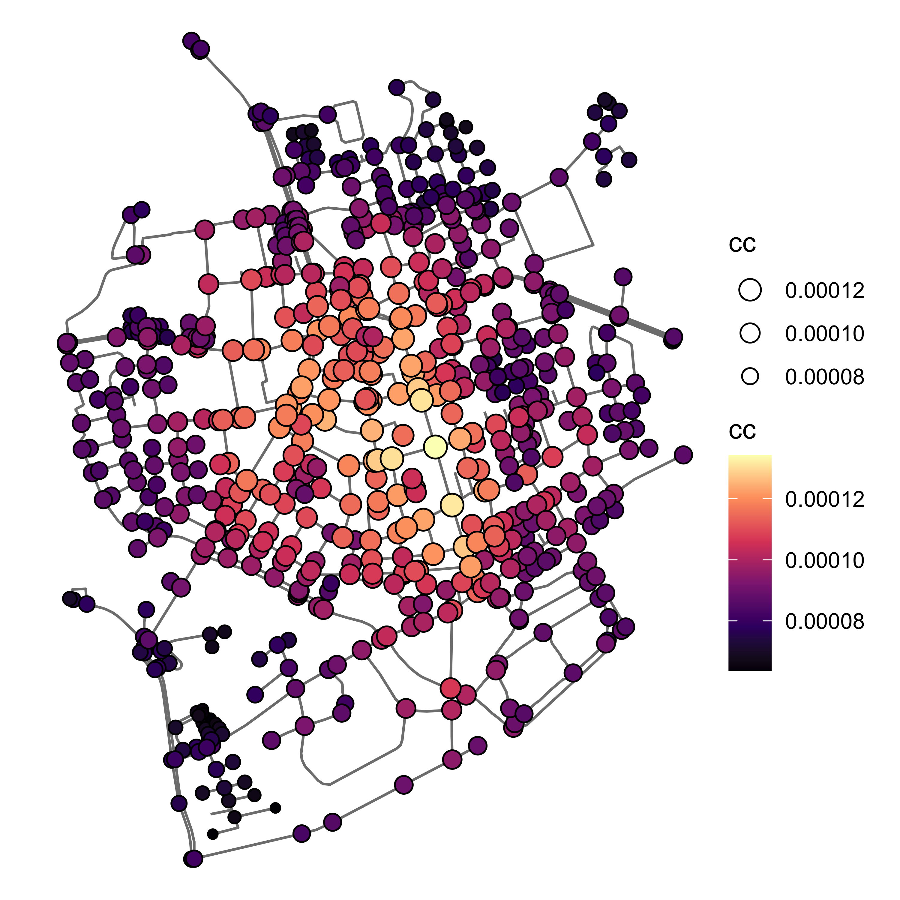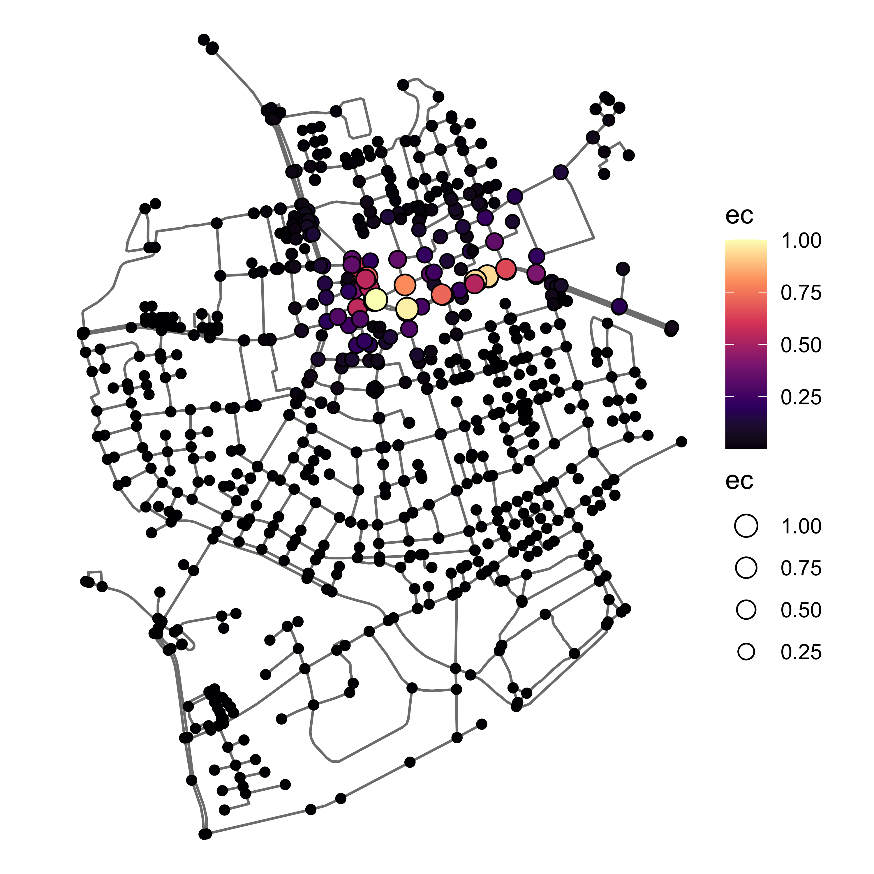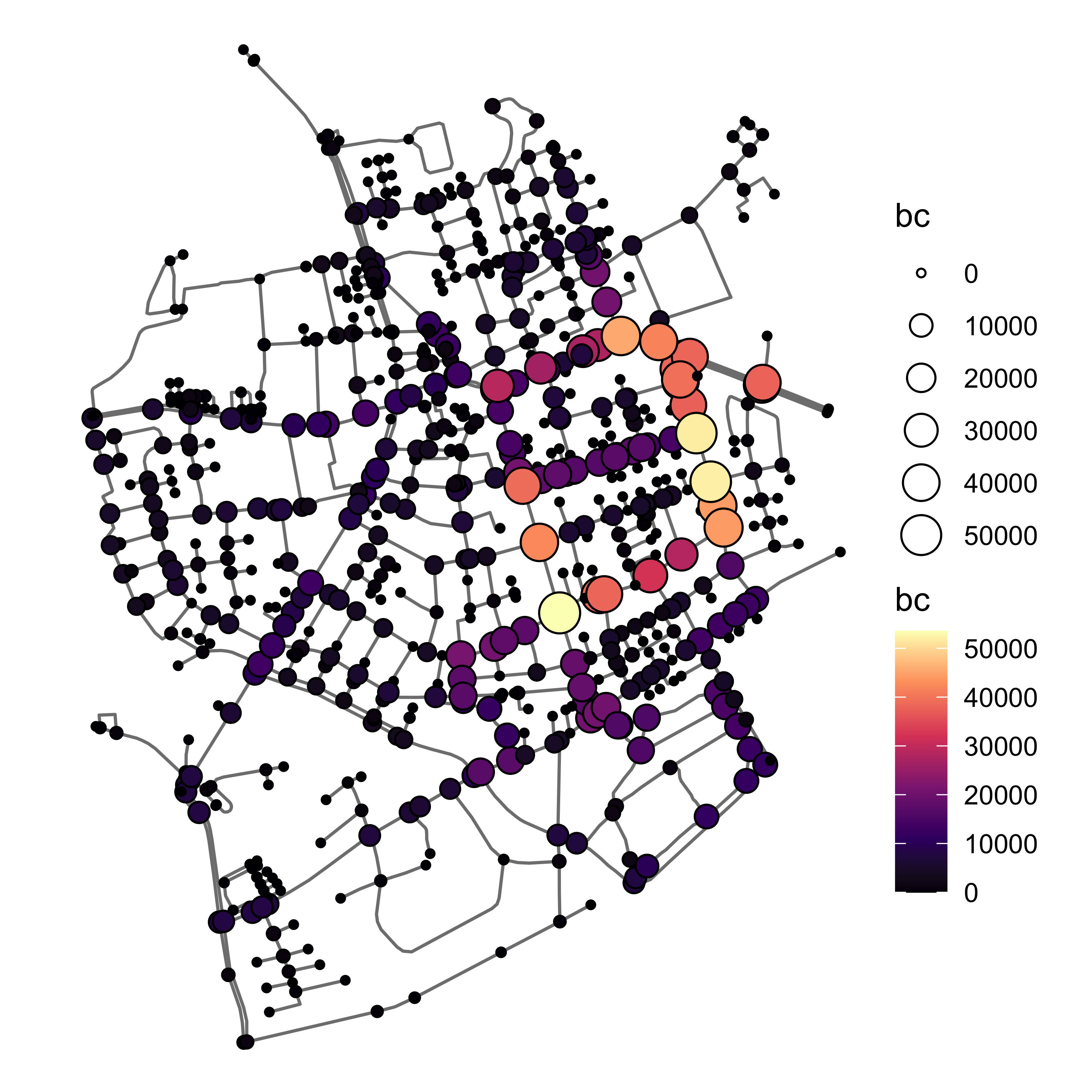 Центральность по промежуточности показывает количество маршрутов, проходящих через узел/ребро.