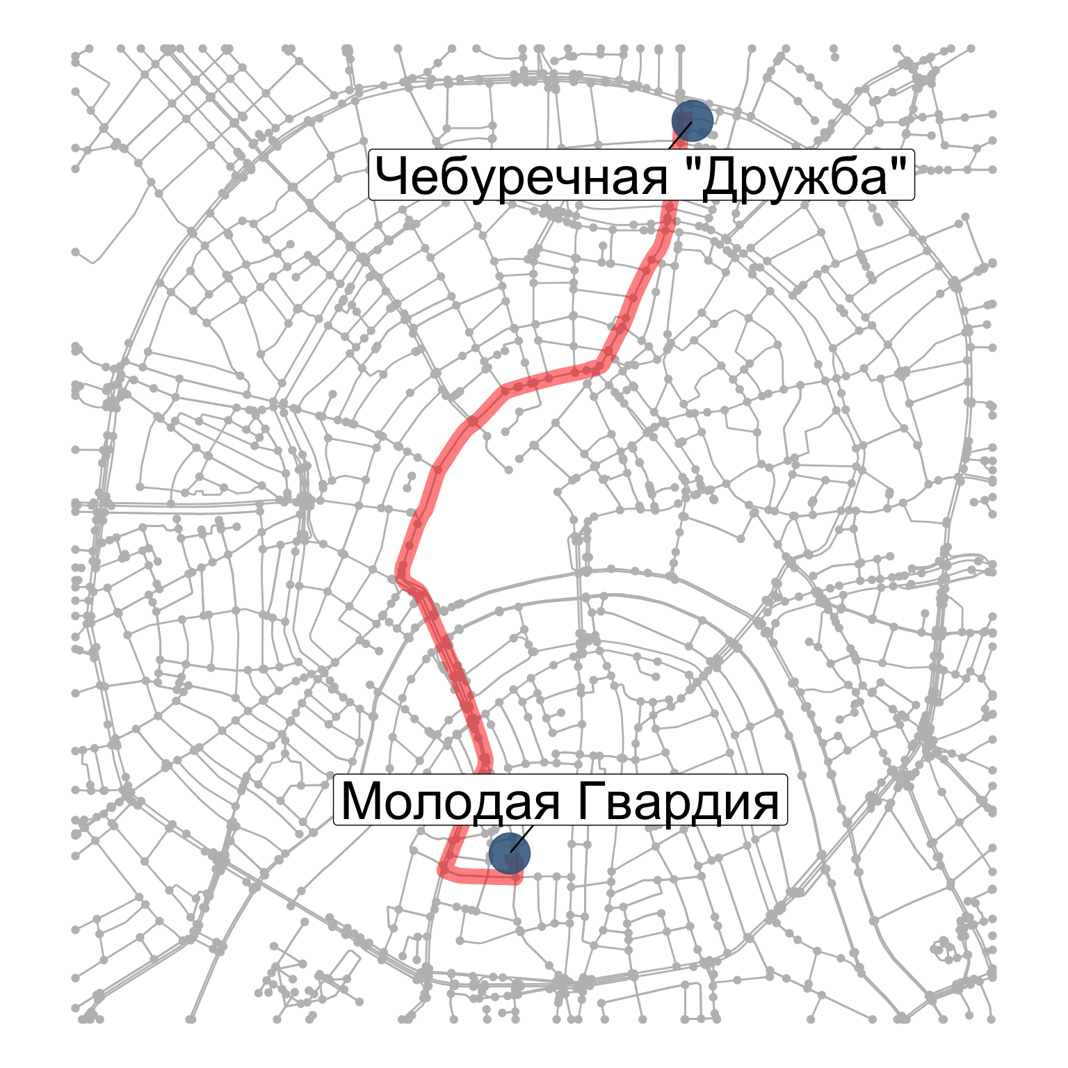 Выполняется поиск последовательности ребер графа, которая дает минимальную стоимость передвижения между точками.