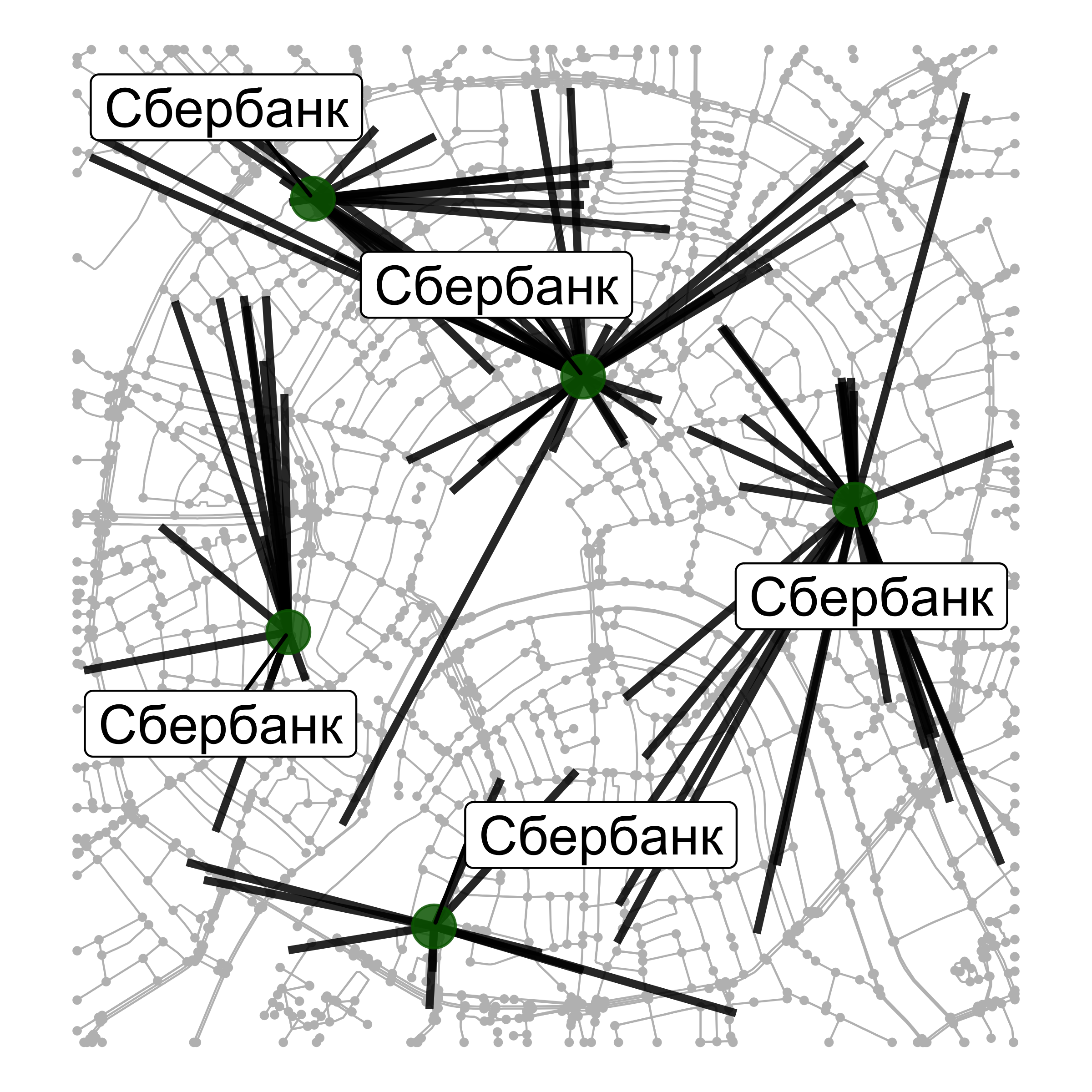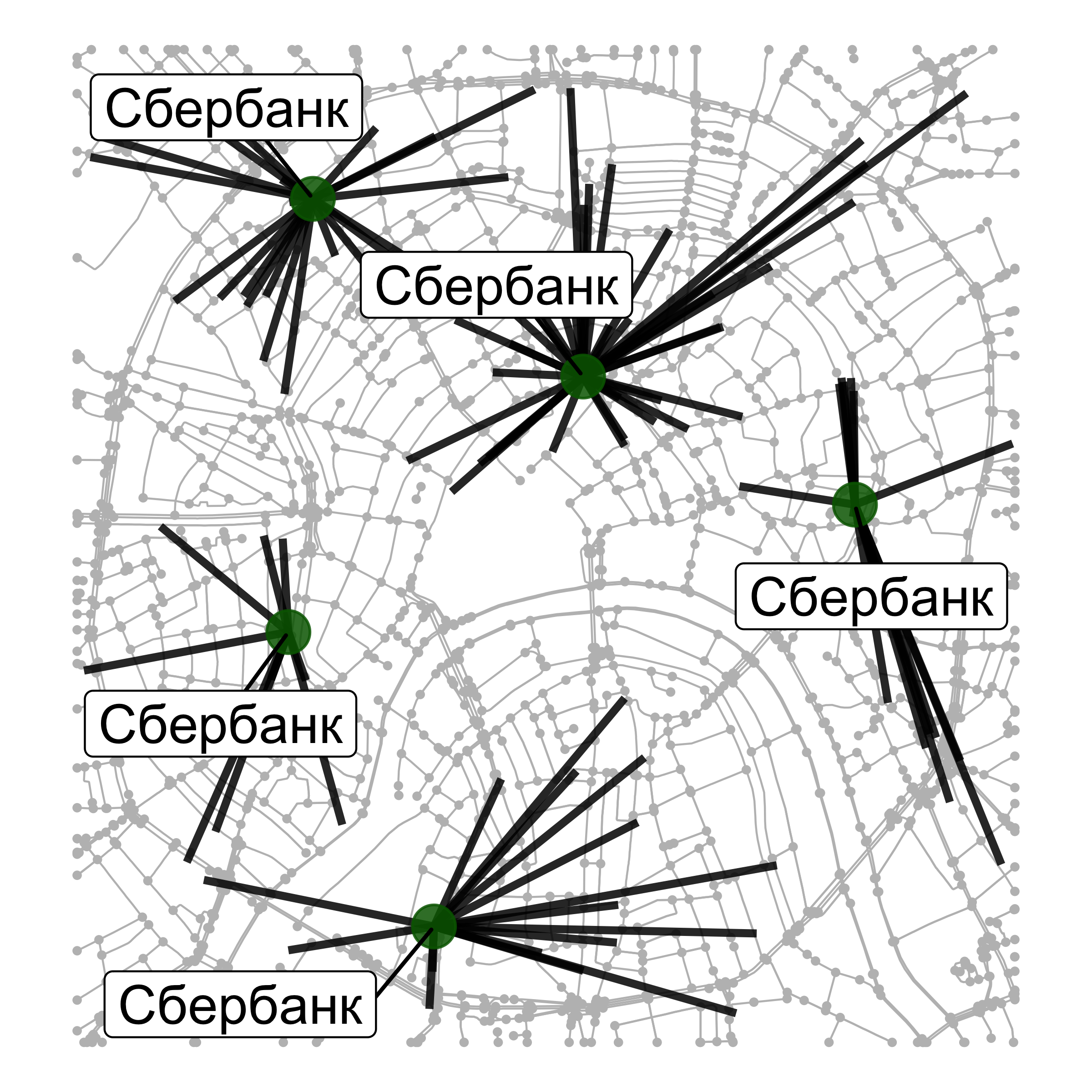Для каждого заведения общепита найти ближайшее по времени отделение Сбербанка для пешехода