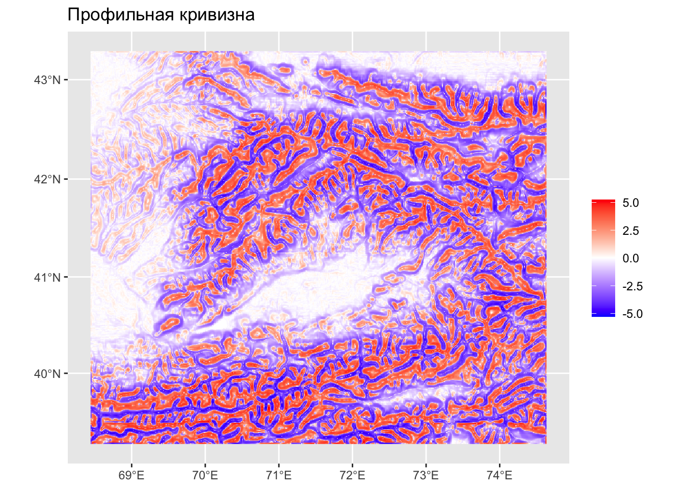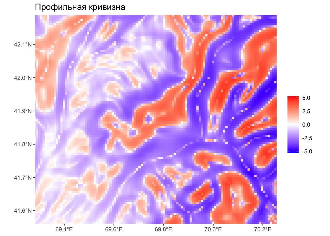 Кривизна склона в направлении максимального уклона. Положительные значению соответствуют вогнутым склонам, отрицательные — выпуклым.