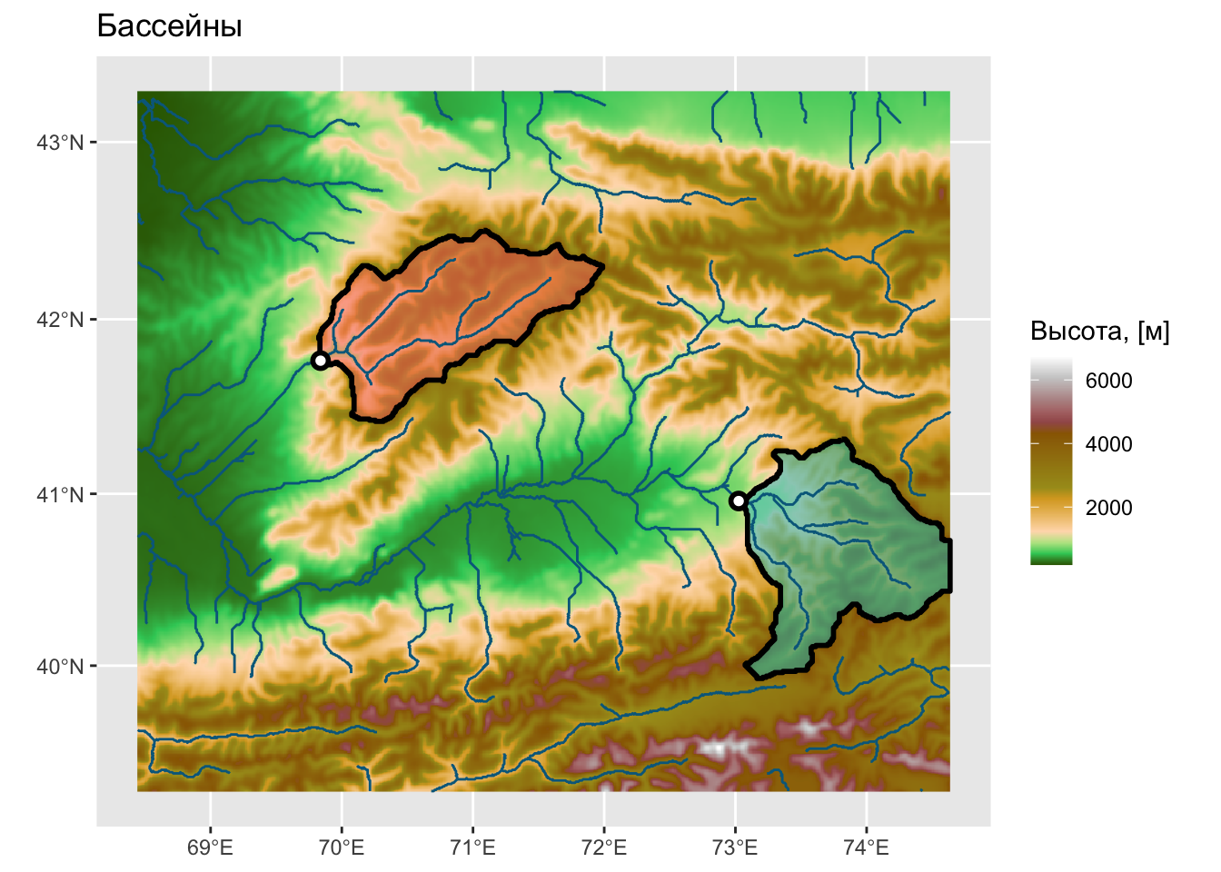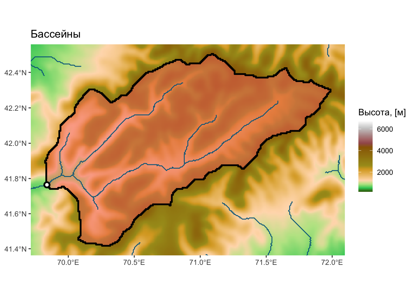 Бассейн получается путём поиска по модели направлений стока всех ячеек, сток из которых попадает в указанную ячейку.