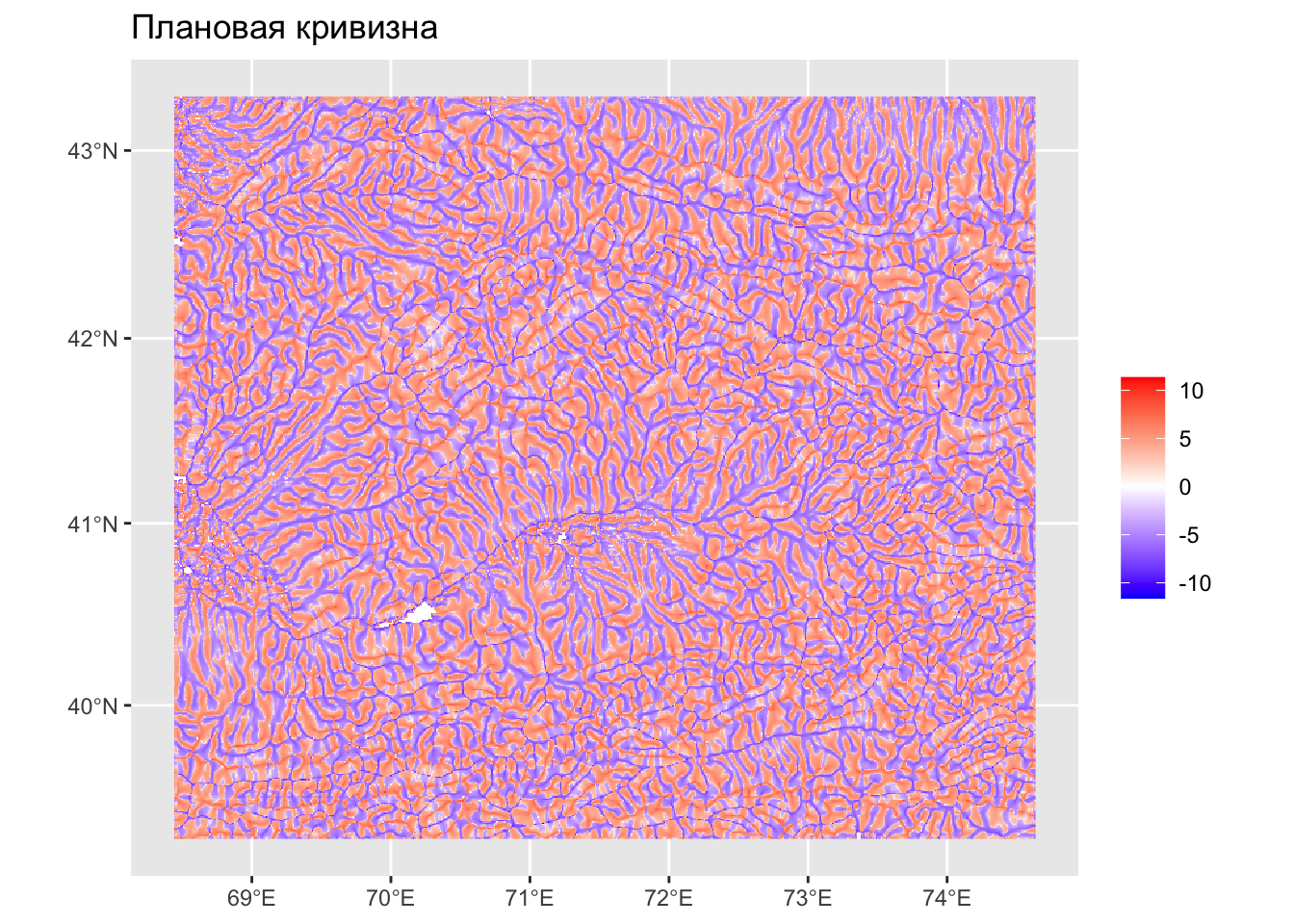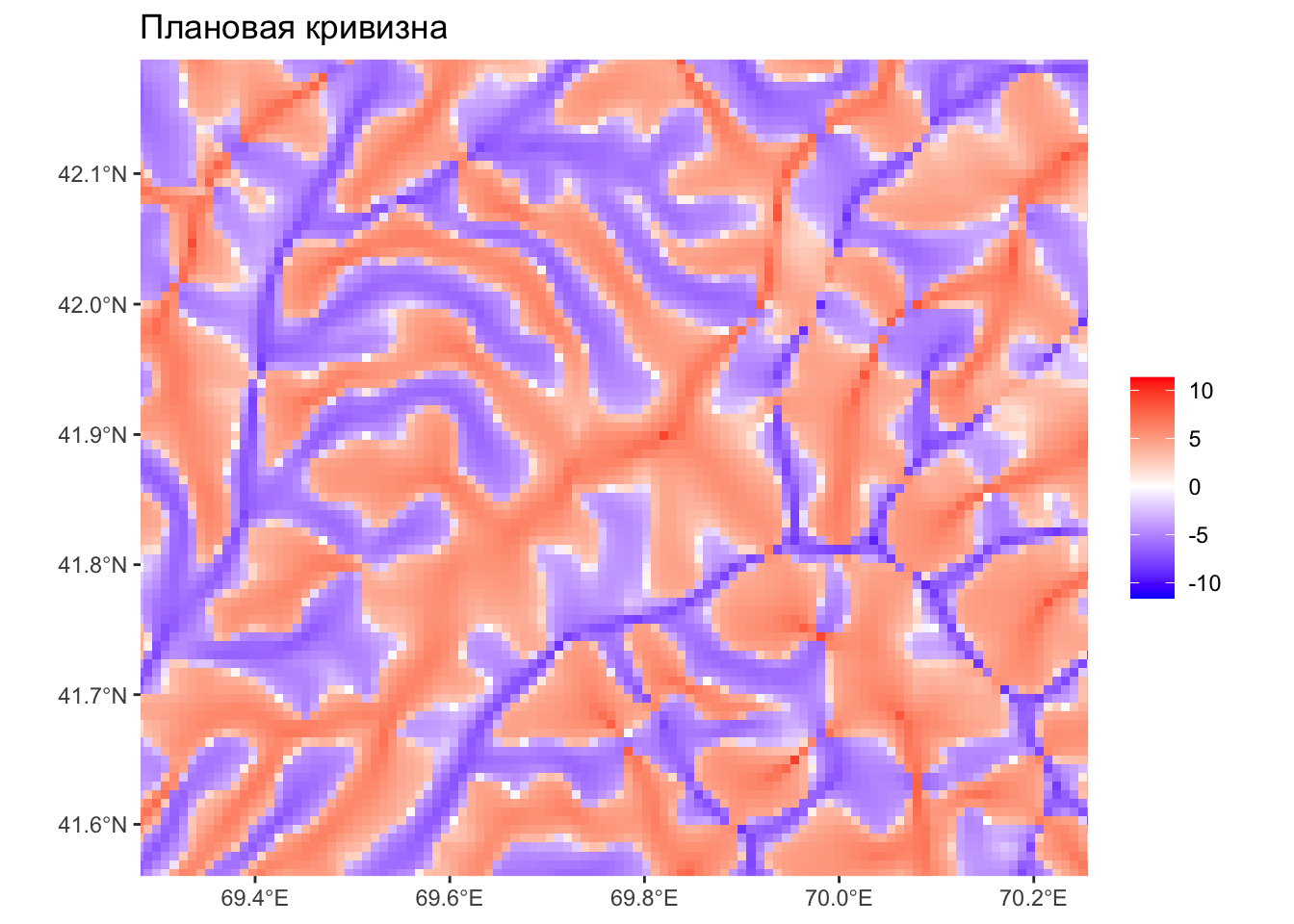 Кривизна изолинии поверхности в точке. Положительные значения соответствуют областям дивергенции (хребты), отрицательные — конвергенции (тальвеги).