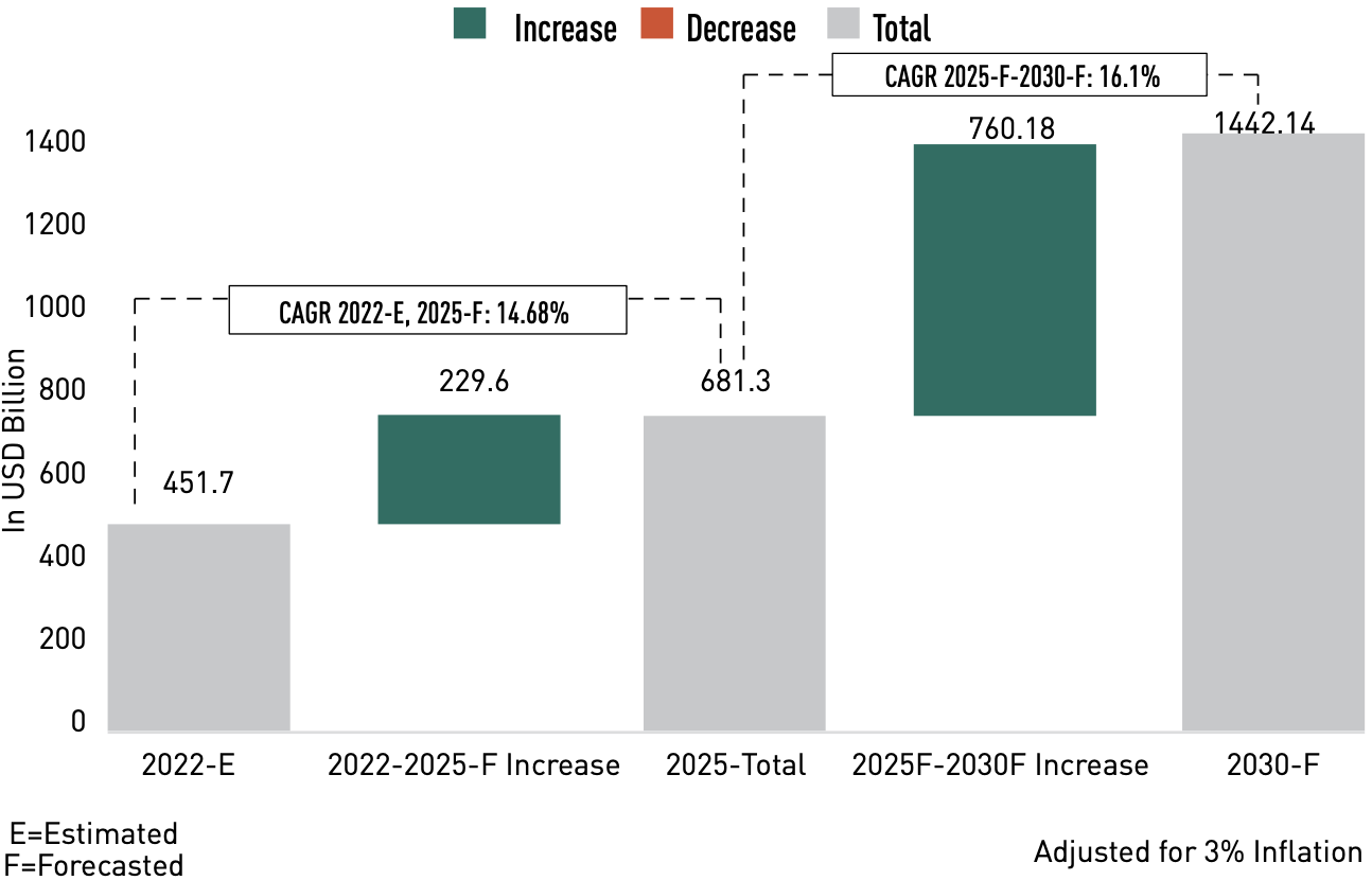 В настоящий момент годовой оборот рынка геоинформационных технологий составляет порядка \(\$450~\textttмлрд\) (Geospatial и UN 2022)