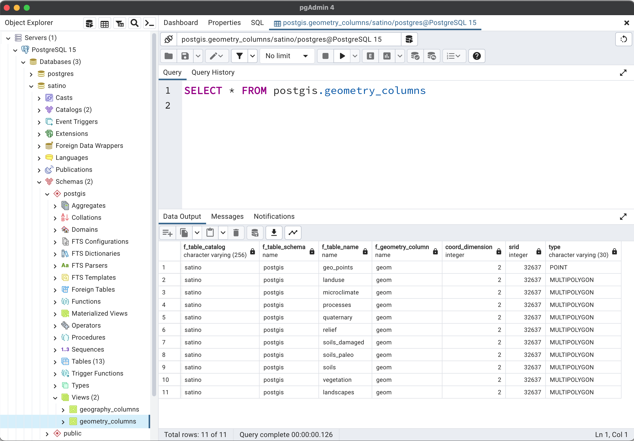 PostGIS при активации создает два представления (View), в которых систематизированы все геометрические и географические атрибуты в БД: